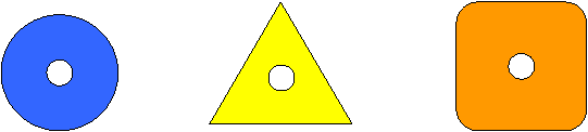 Fig.9, Fig.10 のグラフから、比重の重い金属リムを搭載したほうが、外周に重心が集まりやすいことが分かります。実際の半径の大きさよりも、物体回転時の重心が重要なのです。 金属リムを採用している機種であれば、ボディ本体の構造材質(合成樹脂)より比重の大きい材質がが外周に配置されています。そのため、同形状で質量配分が均質なプラスチック機種より、重心半径が大きくなります。 三角・四角ヨーヨーなどの複雑な形状の場合も、回転重心として考えると円形の仮想回転重心としての質量・半径として考えることができます (Fig.11) (Fig.12) 。