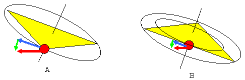 シリウスはなぜぶれやすいのか さて、2005年末に発売された『シリウス(ヨーヨージャム社)』は、金属リムがボディの大部分を占める高級機であるにもかかわらず、ぶれやすいという評価が相次ぎました。その現象について考察します。 まず、優位に幅の広い金属リムの内周と外周の質点の動きを考えてみましょう。最内周部はプラスチック製なので重量は無視できると考えて、外周のウエイトの最内周部分と最外周部分のジャイロ効果に着目します。 ジャイロ効果については『ジャイロ効果』で説明しましたが、Fig.17 に示す運動エネルギー(赤)に対して回転面の変化(青)が発生した場合、回転面を戻そうとするジャイロ効果(緑)が発生します。外周Aと内周Bでのジャイロ効果を比較すると、内周Bの方が慣性モーメントも実際の回転速度もかなり小さく、結果的にジャイロ効果も小さくなります。外周Aでは、逆にジャイロ効果が大きくなります。