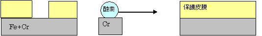 まずステンレスとは何なのでしょう。ステンレス鋼とは、鉄に少なくとも10.5%以上のクロムを含有した合金鋼の総称です。ステンレス(Stainless)は「さびない」という意味で、日本でも古くは「さびない鋼」とか「不銹鋼」という名で呼ばれていました。最近では「ステンレス鋼」にほぼ統一されています。 鉄にクロムを添加すると、クロムが酸素と結合して鋼の表面に薄い保護皮膜(酸化皮膜)を生成します。この不動態皮膜がサビやよごれの進行を防ぎます (Fig.7) 。また、この不動態皮膜は100万分の3mm程度のごく薄いものですが、大変強靭で、一度壊れても周囲に酸素があれば自動的に再生する機能を持っています (Fig.8) 。